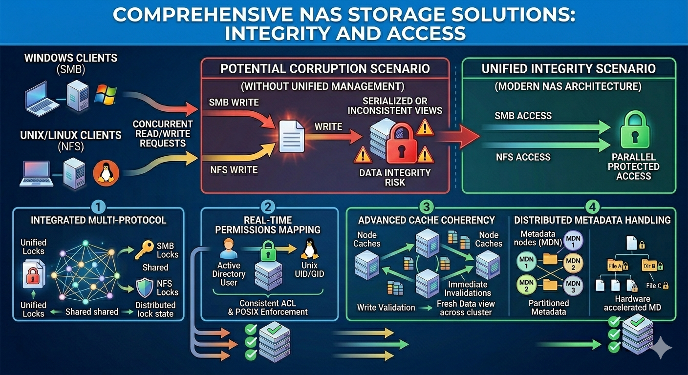 Network Attached Storage (NAS) architectures frequently serve heterogeneous client environments. Windows clients natively utilize the Server Message Block (SMB) protocol, while Linux and UNIX environments rely on the Network File System (NFS) protocol. Wh...